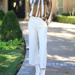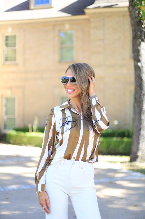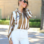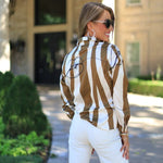 Playfully stylish, the STRIPE A POSE LONG SLEEVE BLOUSE features a button-down design with taupe and cream stripes, accented by a fun sketch lip print. Perfect for adding a cheeky twist to your everyday look.