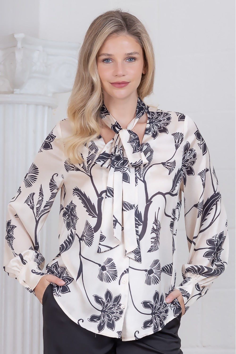 Make a stylish splash with the STYLE STATEMENT LONG SLEEVE FLORAL BLOUSE. Featuring a taupe base adorned with a black floral print, this playful blouse offers long sleeves, a tie-front, and button-down details for a flirty, fashionable look.