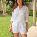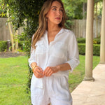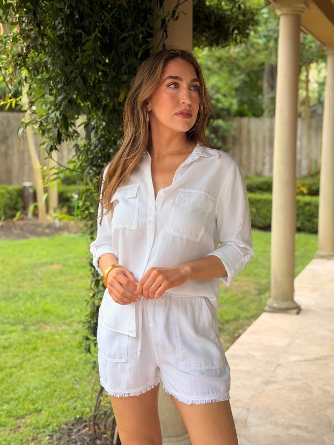 The EVERYDAY ICON WHITE BUTTON DOWN SHIRT features a classic button-down designed for everyday versatility. Features traditional patch pockets and a timeless silhouette that pairs effortlessly with any wardrobe. Perfect for layering, dressing up, or keeping it casual—a wardrobe essential that works for any occasion.