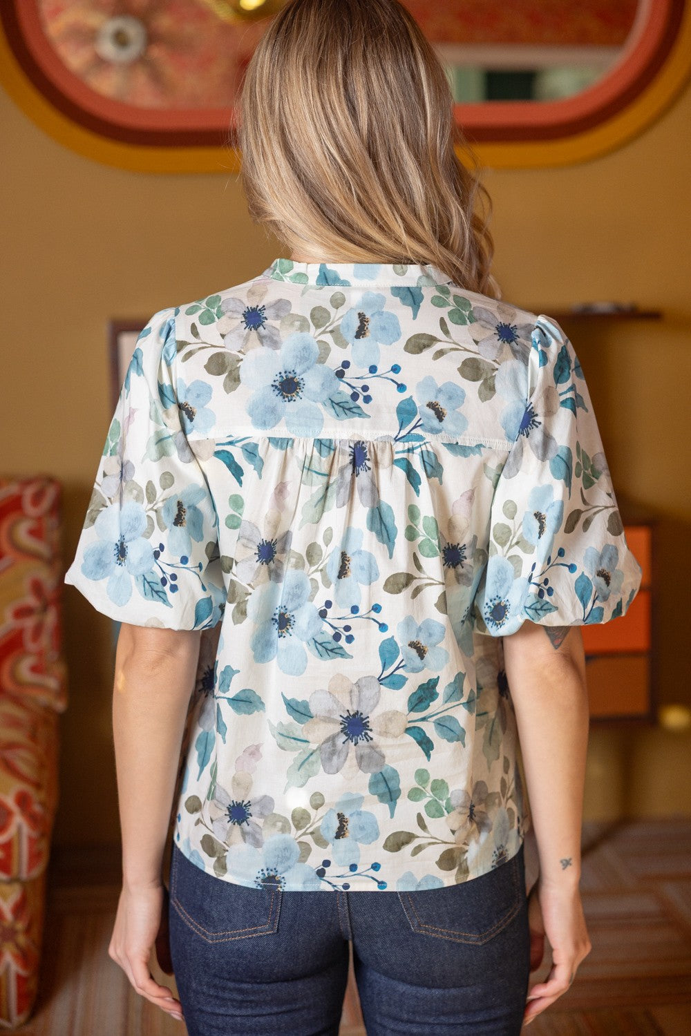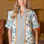 This whimsical A SWEET SURPRISE BLUE FLORAL BLOUSE is your ticket to effortless style with a fun twist. Soft bubble sleeves and a flattering split V-neckline trimmed in contrasting color create instant charm, while playful wavy and stripe details keep things lively. The lightweight woven fabric feels breezy and comfortable, with a relaxed silhouette that moves with you. Perfect for layering or wearing solo, this delightful top brings personality to any outfit and works beautifully from season to season.