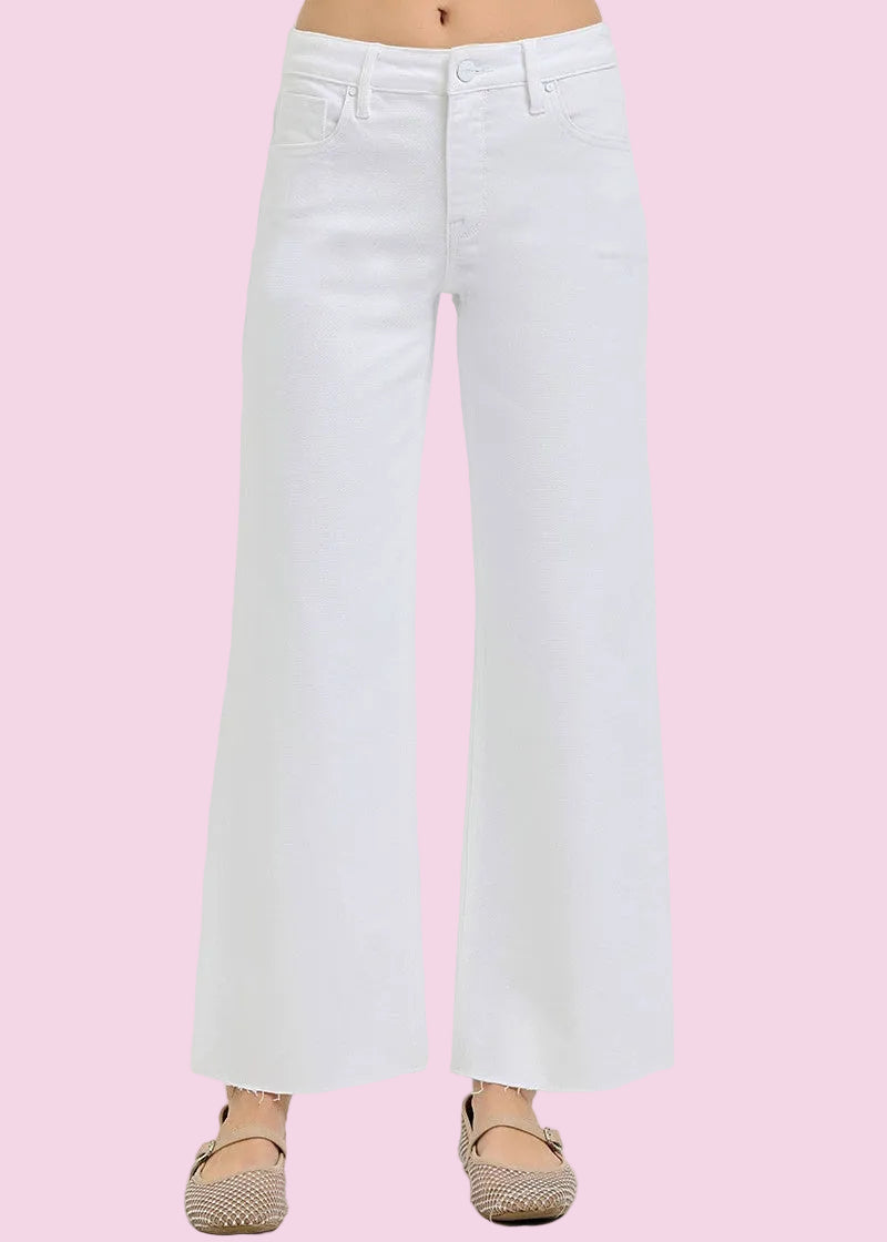 RISEN MID RISE ANKLE STRAIGHT RAW HEM JEANS IN WHITE