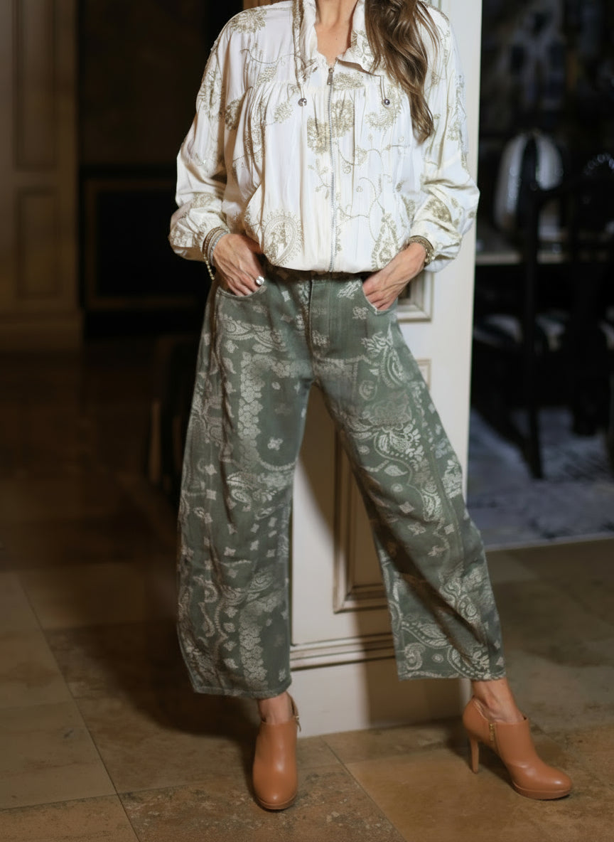 FAN ZONE OLIVE PAISLEY PRINT BARREL JEANS