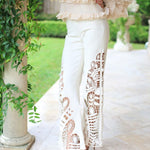 Command attention in the CAUGHT YOUR ATTENTION HIGH RISE LACE WIDE LEG PANTS. These refined high-rise jeans showcase intricate lace embroidery and a wide-leg cut, enhanced by a timeless five-pocket design and exquisite floral cutout detailing along the legs.