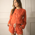 These HAD ME BY HALFTIME BURNT ORANGE SHORTS feature a comfy drawstring elastic waistband and handy side and back pockets. Pair them with the matching jacket for a fun, coordinated outfit.