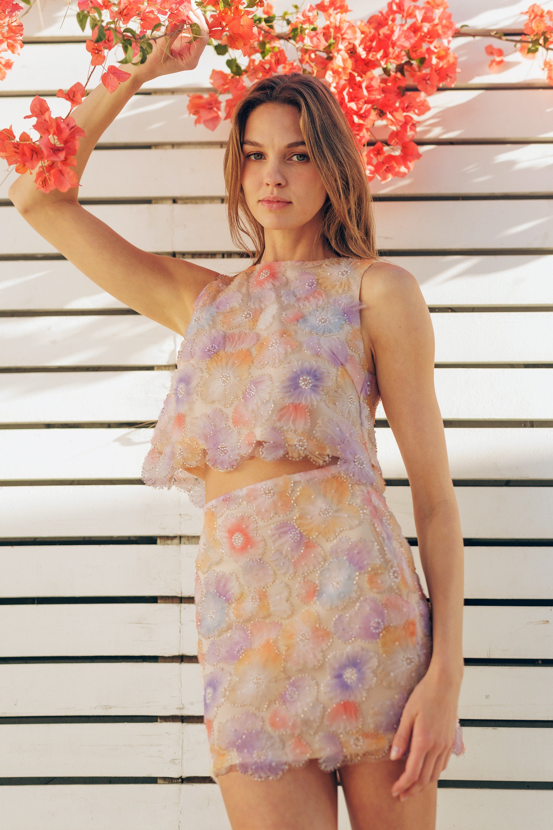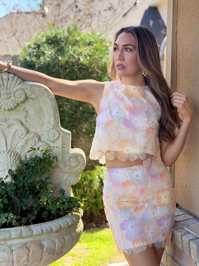 This FOUND TREASURES FLORAL EMBELLISHED SKIRT showcases vibrant, embellished floral designs, creating a bold and stylish statement. Its fitted silhouette offers a sleek and structured look, perfect for a polished outfit. Pair it with the matching tank top for a cohesive ensemble or mix and match with other pieces to suit your personal style.