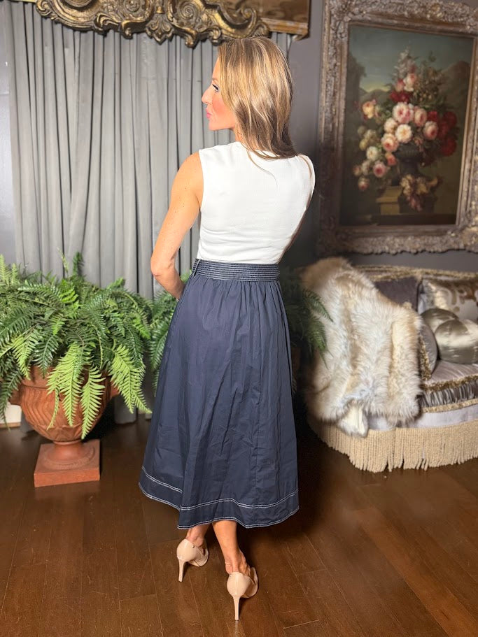 FOREVER IN STYLE NAVY DROP SLEEVE MIDI DRESS