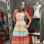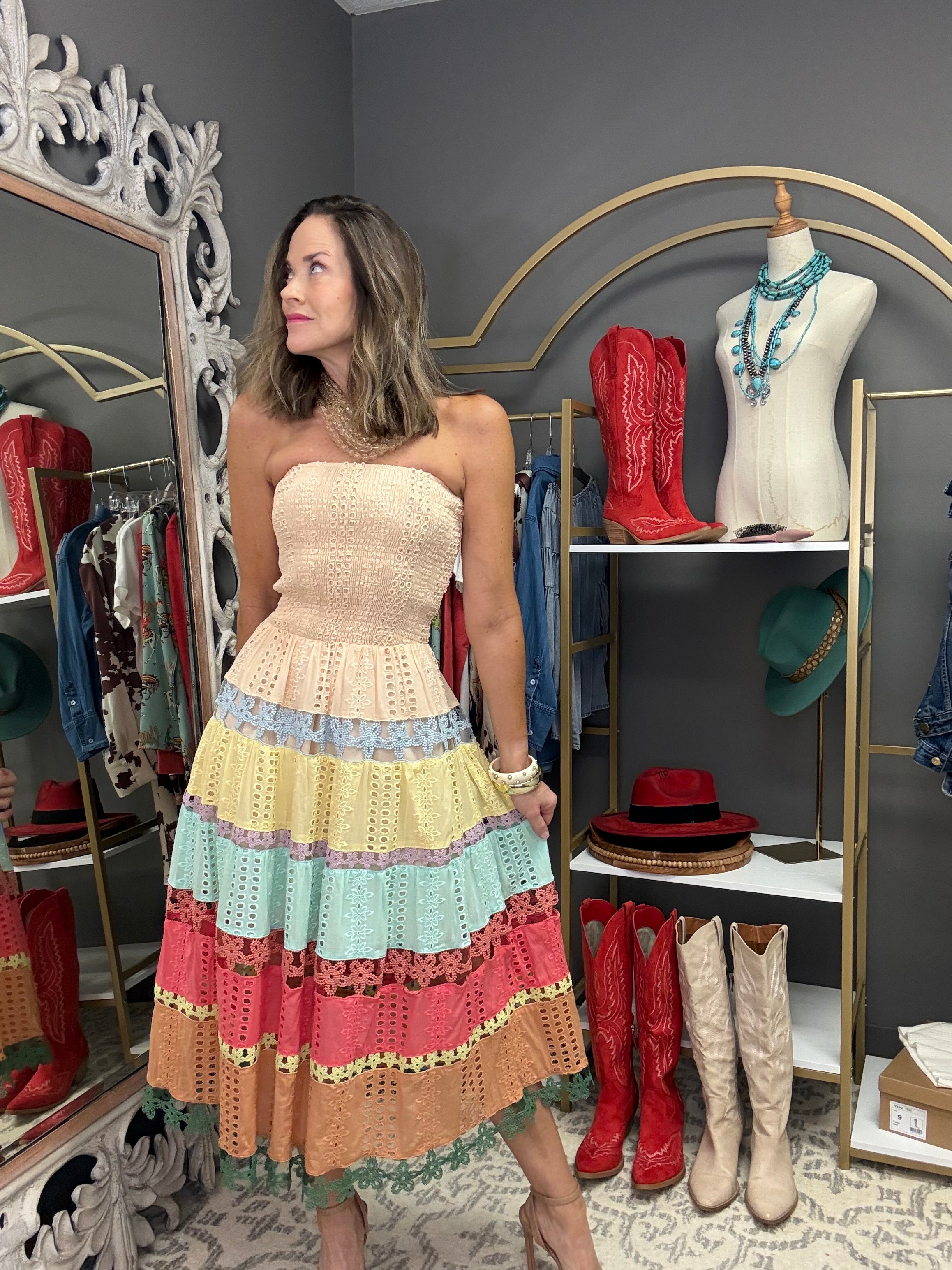 Escape the heat in style with this charming LIVE FOR THE MOMENT COLORBLOCK EYELET DRESS. Crafted from a soft cotton blend with intricate embroidered eyelet detailing, this strapless beauty showcases a colorblock pattern and a fitted smocked tube bodice. The midi silhouette is finished with delicate scalloped crochet lace trim, while half lining keeps you comfortable all day long. Pair it with your favorite sandals and statement jewelry for an effortlessly chic warm-weather look that turns heads.