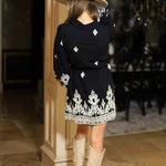 Step out in confidence with the MADE THE RIGHT CALL BLACK EMBROIDERED MINI DRESS. Featuring sleek black fabric, long sleeves, a button-down front, elegant ivory embroidery, and a flattering belt, this dress is designed to make every moment unforgettable.
