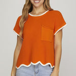 Show your school spirit with the COLLEGE PRIDE GAME DAY SWEATER! Featuring a cozy crew neck with crisp white trim, a handy breast pocket, and a scalloped hem, it’s perfect for cheering on your team in style. Choose maroon or orange and get game day ready!
