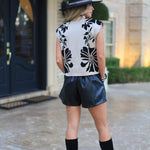 Elevate your style with the UPTOWN MANHATTAN SLEEVELESS SWEATER. This ecru sweater features a bold floral print, a ribbed mock turtle neck, and a relaxed drop shoulder design—all without sleeves for a chic, modern look.