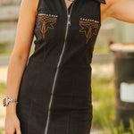 Stand out with the WESTERN SKIES VINTAGE STUDDED SLEEVELESS DRESS, merging bold Western style with modern design. Its structured stretch fabric shapes a flattering fit, while the full front zipper combines practicality with attitude. Featuring pointed collars and studded chest pockets, it channels a rebellious cowgirl vibe. The striking embroidered Western yoke on the front pockets adds iconic detail. This dress perfectly balances classic rodeo charm with contemporary edge, ideal for concerts, rodeos, or chic Western evenings. Wear it alone or paired with a fringe jacket to elevate your look.
