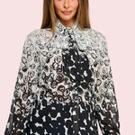 The BOARDWALK BLISS PRINT BUTTON DOWN features a playful abstract black and white design, complete with gold buttons, a chic scarf tie at the neckline, and long sleeves for a stylish twist on a classic button-down.