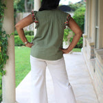 Meet the BISTRO CUTIE OLIVE FLUTTER SLEEVE BLOUSE! Made from soft cotton seersucker, it features fluttery sleeves with sweet embroidered flowers, a fun ruffle collar, a button-down front, and a straight hem for an easy, breezy look.
