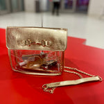 Meet the GO TEAM CLEAR CROSSBODY GAME DAY BAG – your go-to bag for stadium games, concerts, or any event where style and security go hand-in-hand. Made from sleek, transparent PU, this compact cutie is perfect for storing your essentials while staying event-compliant. It features a chic gold chain strap with a vegan leather shoulder detail that’s both comfy and detachable.