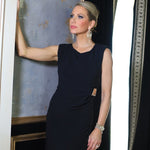 Elevate your style with the GLAMOUR GIRL BLACK DRAPED MAXI DRESS, featuring padded shoulders, a gracefully draped front secured by a gold clasp, and side slit hem for a refined silhouette.