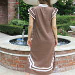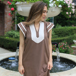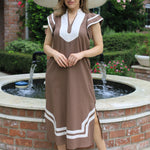 This ENGLISH COURTYARD LINEN BLEND MIDI DRESS features a mocha and cream color block design crafted from a comfortable linen and cotton blend. It includes stylish puff sleeves, a side split hemline, a lined interior for added comfort, and convenient pockets, making it both elegant and practical for any occasion.