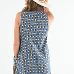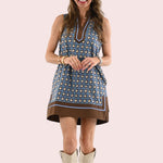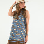 Embrace the season with the CATCHING FALL FEELS FLORAL SHIFT DRESS. Made from soft cotton, this sleeveless dress features a blue floral pattern accented by rich brown trim. Designed with a straight split hemline and practical pockets, it’s fully lined for added comfort and style.