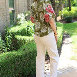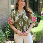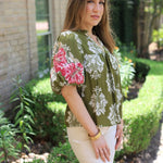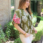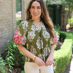 The GARDEN SERENADE EMBROIDERED SLEEVE FLORAL BLOUSE features an olive floral pattern with beautifully embroidered sleeves. It has a flattering V-neckline and a straight hemline for a comfortable, stylish fit.