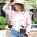 Slip into the MANE ATTRACTION KNIT CARDIGAN SWEATER—your new cozy companion! With its playful horse print in pink and taupe, button-down front, long sleeves, and comfy relaxed fit, this collared sweater adds a fun and flirty twist to any outfit.
