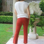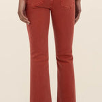Make a bold impression in these vibrant paprika pants, featuring a high rise waist, ankle length kick flare, and edgy raw hem. The perfect accent piece to elevate any look.