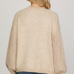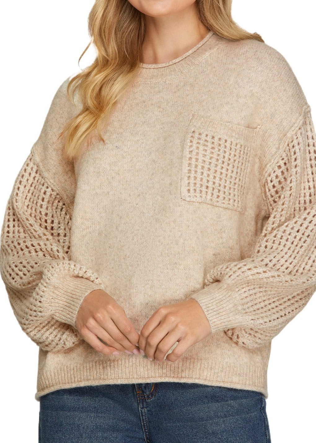Stay comfortable and stylish with this FEELING COZY CREW NECK SWEATER in taupe. Featuring long sleeves, a breathable open weave design on the sleeves, and a convenient front pocket, it’s perfect for keeping warm while adding a chic touch to your outfit.