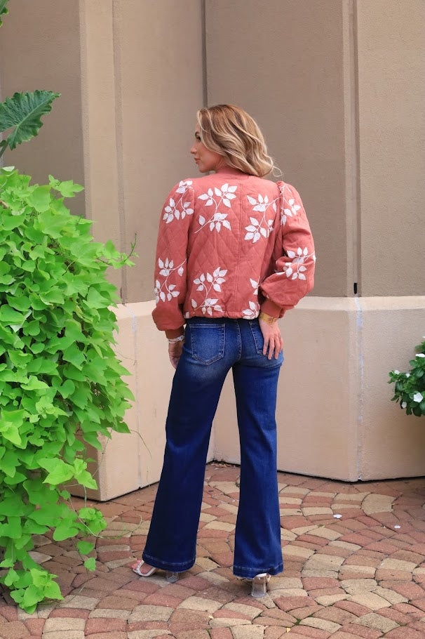 Cozy up in this terracotta CABIN COZY EMBROIDERD QUILTED JACKET, decked out with charming leaf embroidery. Featuring a snap-down front, long sleeves, a collared neckline, and a relaxed fit, it’s perfect for adding a playful touch to your casual look.