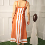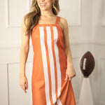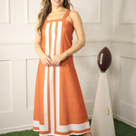 Get ready to root for your team in style with the PEP SQUAD BURNT ORANGE AND WHITE COLORBLOCK MIDI DRESS. Featuring wide shoulder straps and a breezy, lightweight feel, its rust and white striped pattern adds a playful touch to your game day look.