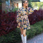 Discover the ALL YOURS HONEY PLAID DETAIL DRESS! Featuring a floral navy base with striking plaid pleat accents, this dress offers a round neckline, long sleeves, a flattering belt, and a flowing full skirt. Perfect for making a stylish statement.