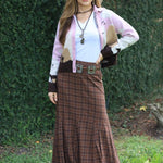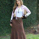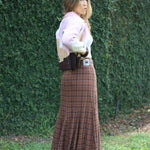 The SO PLAID YOUR MINE MAXI SKIRT features soft cotton fabric with pleats and a comfortable elastic waistband, styled in a warm brown plaid pattern.