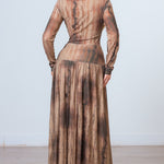 Introducing the BEAUTIFUL EVENINGS DROP WAIST MAXI DRESS in a rich coffee multicolor. Designed with a cinched waist and long sleeves, this dress blends comfort and style with its slight stretch fabric and delicate burnout pattern. The boat neckline and flowing flare skirt create an elegant silhouette, while the lining and side zipper provide ease and coverage. With subtle sheer accents, this maxi dress promises a graceful look for your special occasions.