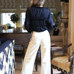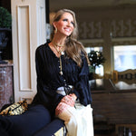 Update your wardrobe with the COSMOS WITH THE GIRLS BLACK RUFFLE BLOUSE. Featuring a sophisticated ruffle neckline, flowing billowy sleeves, a timeless button-up front, gathered bodice, and a flattering drawstring waist, this long-sleeve blouse offers a polished and fashionable look perfect for any event.