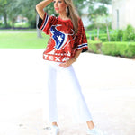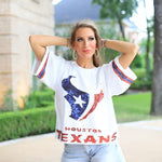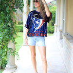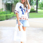 Get ready to shine on game day with the GAME DAY VIBES SEQUIN JERSEY! Featuring a sparkling sequin fabric and a charming bullhead graphic, this jersey blends sporty style with a fashionable edge. Its relaxed fit and classic crew neckline offer comfort, while the white base with blue and red sleeve stripes adds a vibrant touch. Fully lined for ease, this trendy piece will have you glowing brighter than the stadium lights. Perfect for showing off your team spirit with flair.
