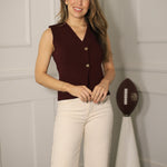 This charming KICKOFF CUTIE SLEEVELESS MAROON SWEATER VEST is accented with gleaming gold buttons, bringing a lively and chic flair to any game day look.