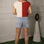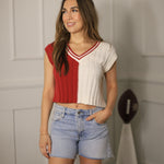 Show your team spirit with the FAN ZONE TWO TONE V-NECK SWEATER! This fun, sleeveless cropped sweater features a maroon and cream colorblock design and a cozy ribbed V-neck, perfect for cheering in style.