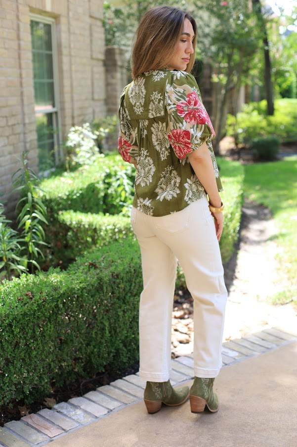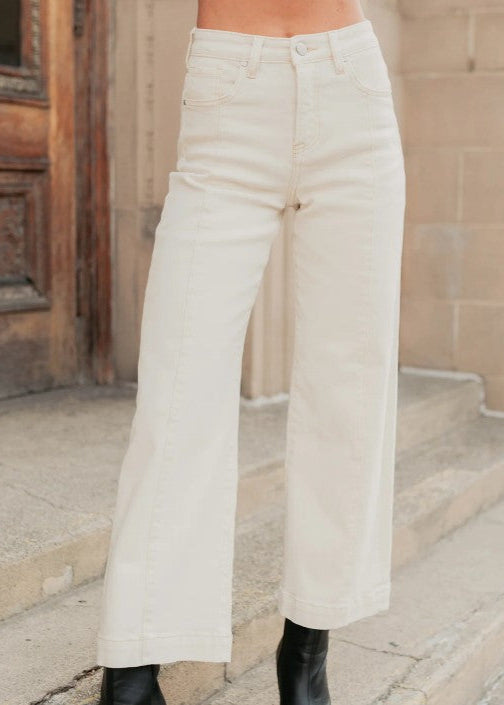 RISEN JEANS - HIGH RISE CROP WIDE JEANS. These ivory denim jeans offer tummy control with a flattering high-rise fit, cropped length and feature a stylish center seam detail.