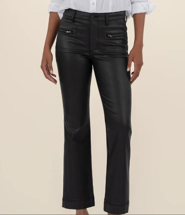 The KUT KELSEY FLARE JEANS IN BLACK introduce a striking edge to your collection with their coated, smooth, and supple fabric that offers a refined leather-like appearance. Accented by polished front welt pockets with zipper accents, these jeans effortlessly merge modern sophistication with everyday comfort.