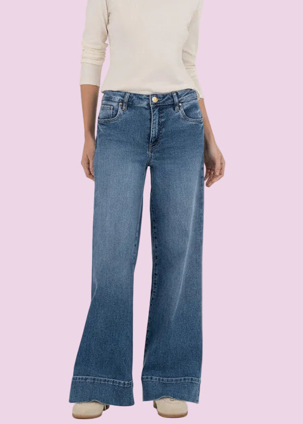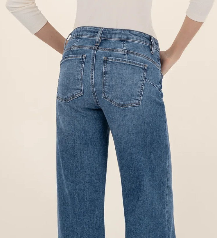 These KUT MAYA HIGH RISE WIDE LEG strike the perfect balance between structure and comfort. Designed in a classic medium wash with a bold wide hem, they bring an effortlessly polished feel to any look. Fab Ab pockets offer subtle shaping, while the stretchy material keeps the fit easy and flattering all day long.