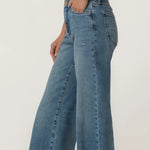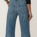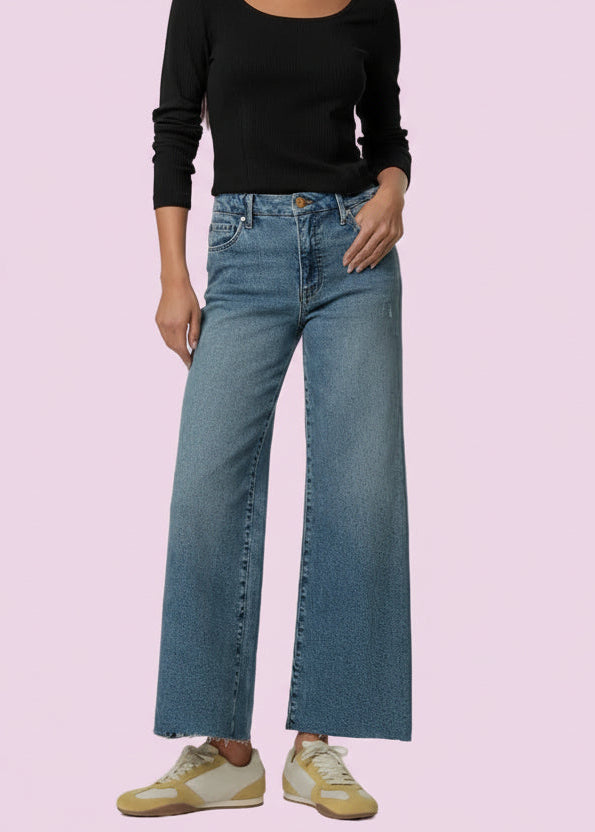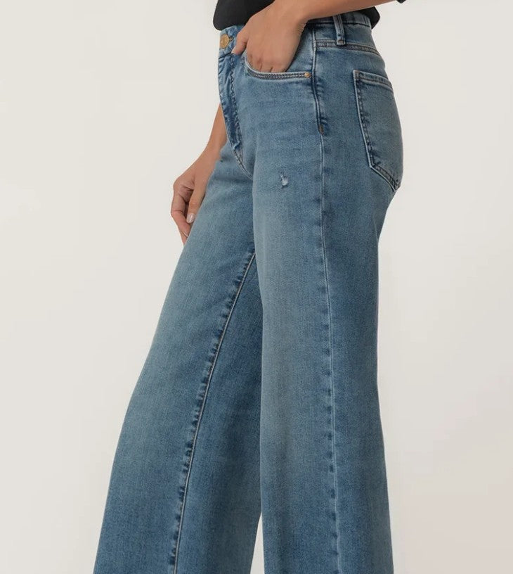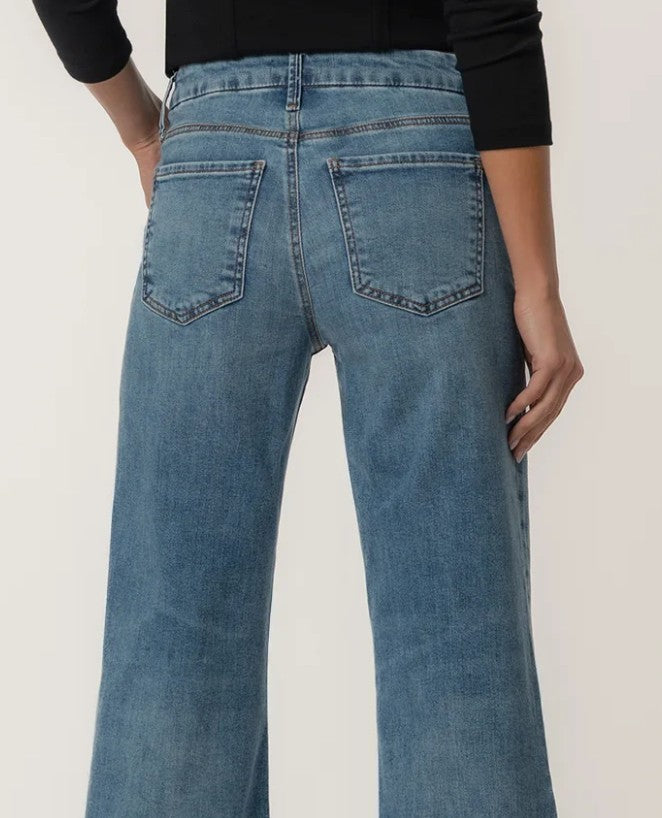 These KUT MEG HIGH RISE WIDE LEG MEDIUM in a classic medium wash feature Fab Ab pockets for a smooth, flattering fit and stretchy fabric for all-day comfort. A raw hem and a hint of distressing give them a lived-in feel with a modern edge. Effortless and versatile, they’re your new go-to for casual cool.