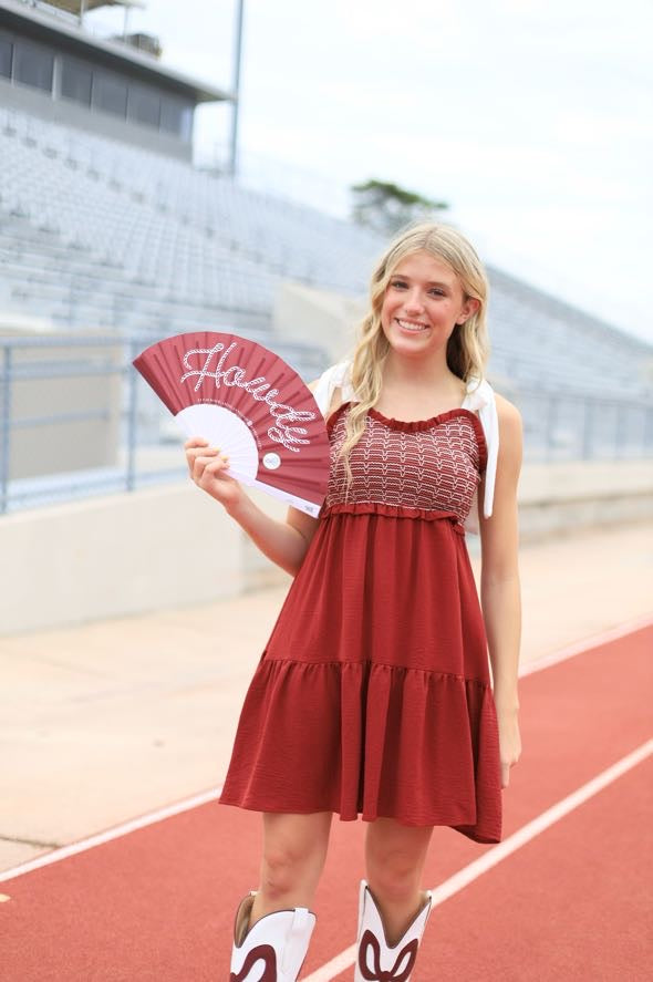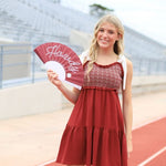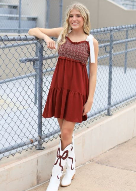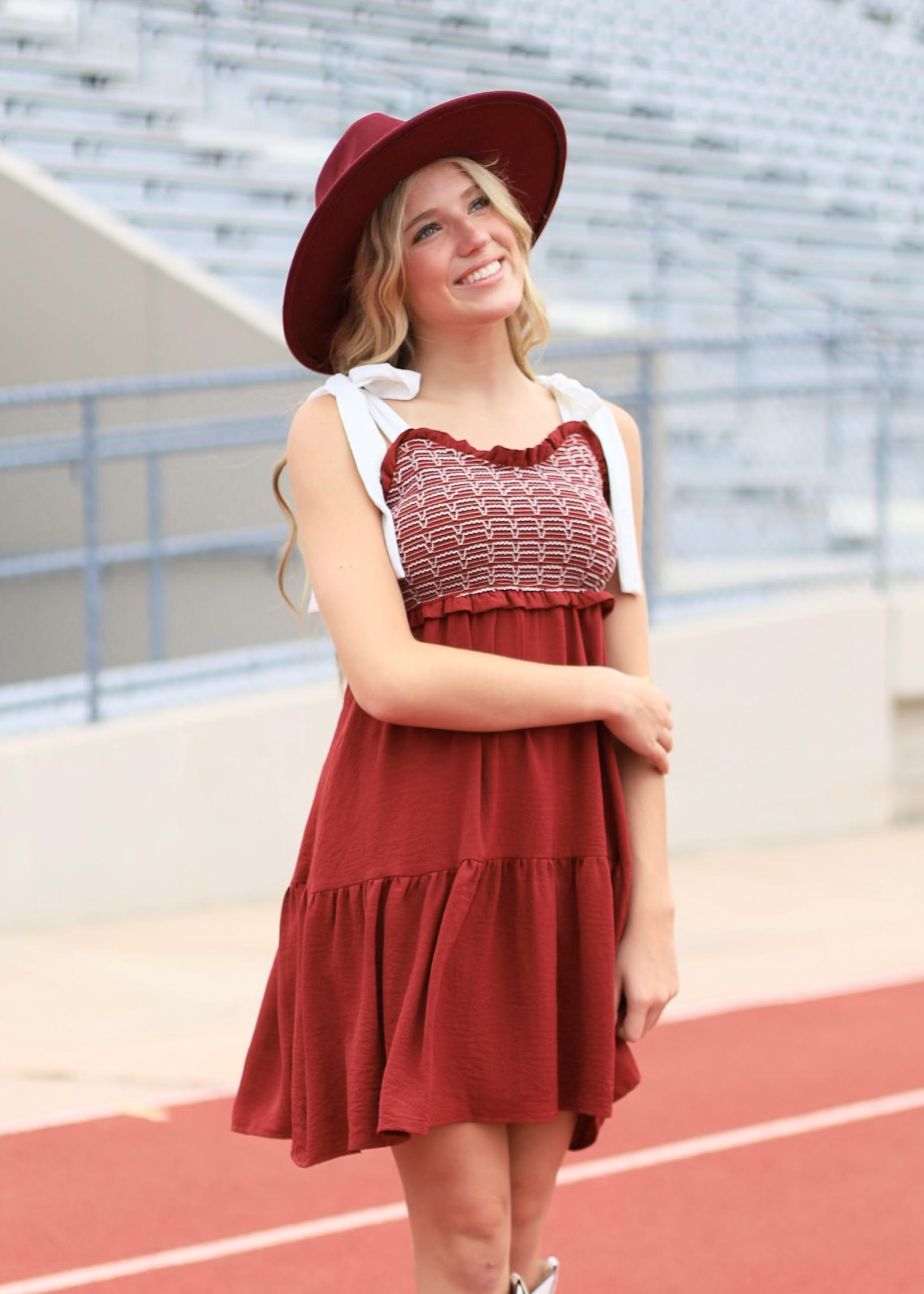 The HERE FOR THE WIN MAROON DRESS features a maroon smocked bodice paired with white bow straps, enhanced by ruffled seams, handy pockets, and a tiered hem that offers a graceful, feminine shape.