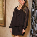 The Double Trouble Bubble Tiered Dress in chocolate features a charming ruffle neckline with a tie, long sleeves, and a flattering drop bubble waist. Its playful bubble hemline adds a stylish, fun touch that makes this dress a standout choice for any occasion.