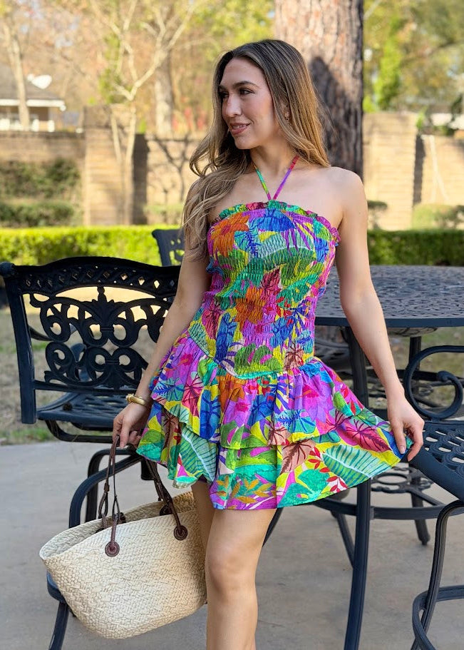 RESORT READY BOTANICAL RUFFLE HALTER DRESS