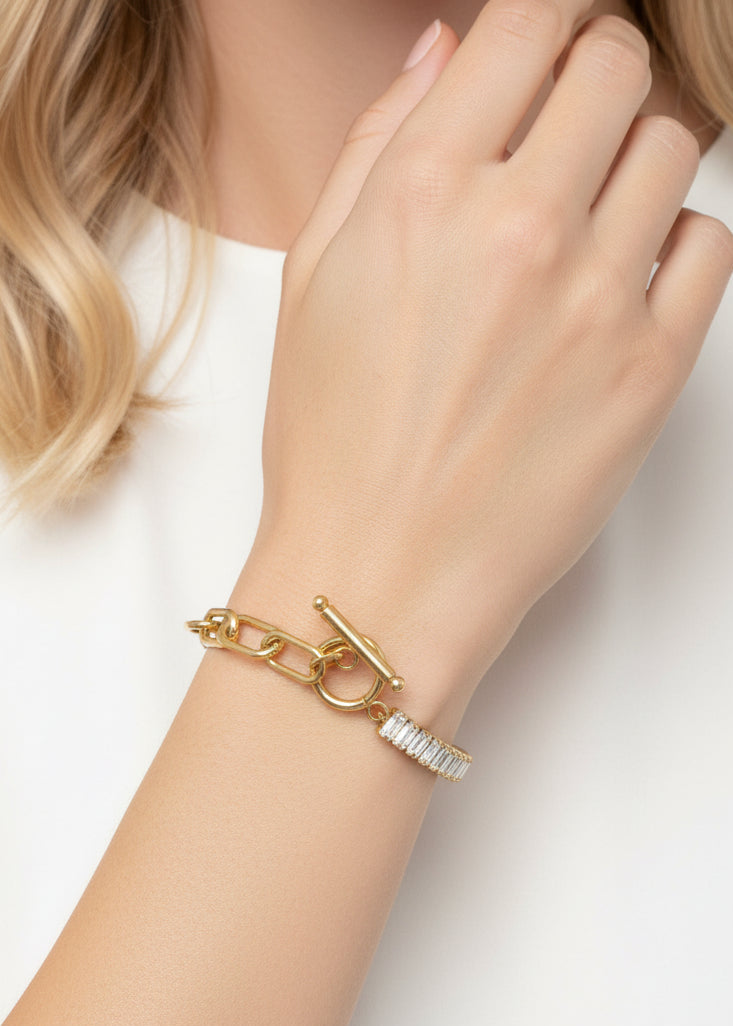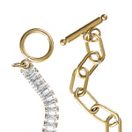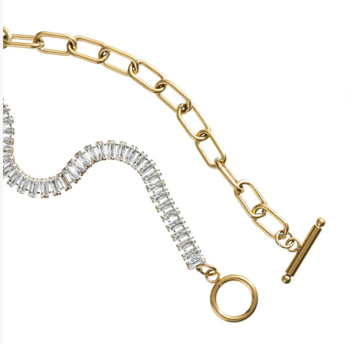 Introducing your new favorite dynamic duo....the INDULGE ME TENNIS & PAPERCLIP BRACELET! This tennis and paperclip bracelet is a match made in fashion heaven, blending classic elegance with a modern twist for a look that's truly unforgettable. Crafted from waterproof 18K gold-plated stainless steel, this bracelet is designed to be a staple in your collection, effortlessly complementing your style with its timeless charm. Embellished with squared crystals that sparkle with brilliance, it adds the perfect touch of glamour to any ensemble. For the ultimate style statement, pair it with the matching choker and prepare to turn heads wherever you go!