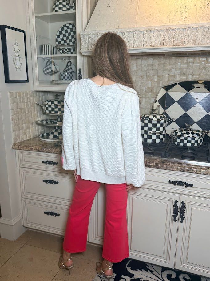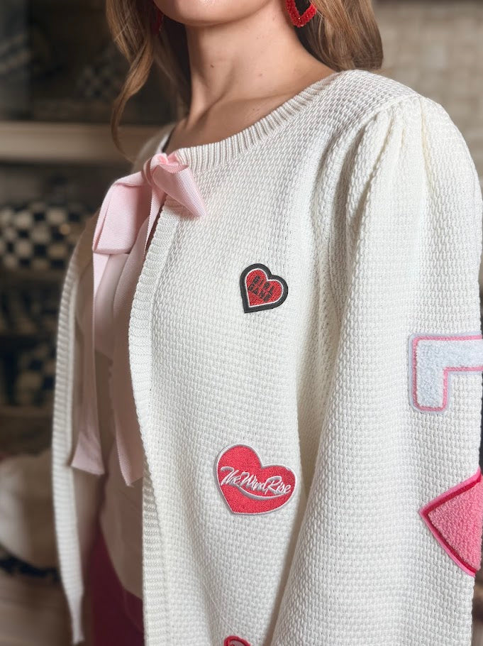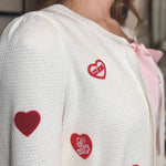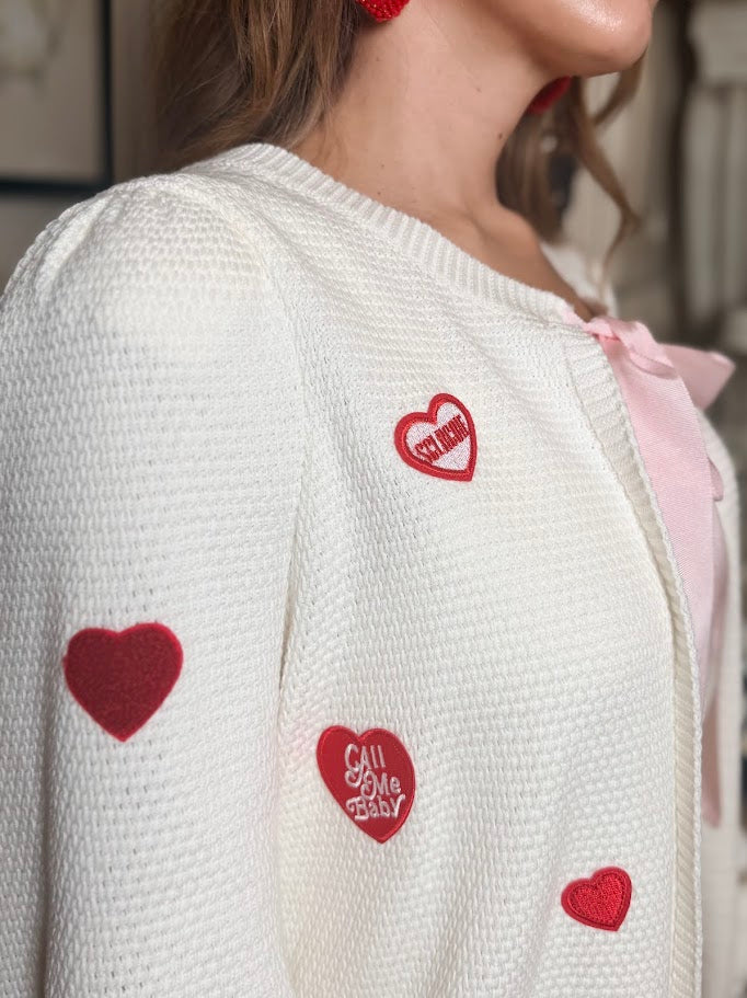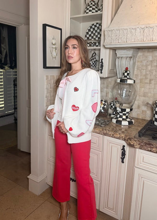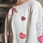 Embrace romance with this DARLING DETAILS VALENTINE CARDIGAN, showcasing intricate appliqué details and a charming ribbon bow at the front. Long sleeves provide comfortable coverage while the thoughtfully designed closure adds a touch of feminine sophistication. Perfect for layering, this piece transforms any ensemble into something truly special and memorable.