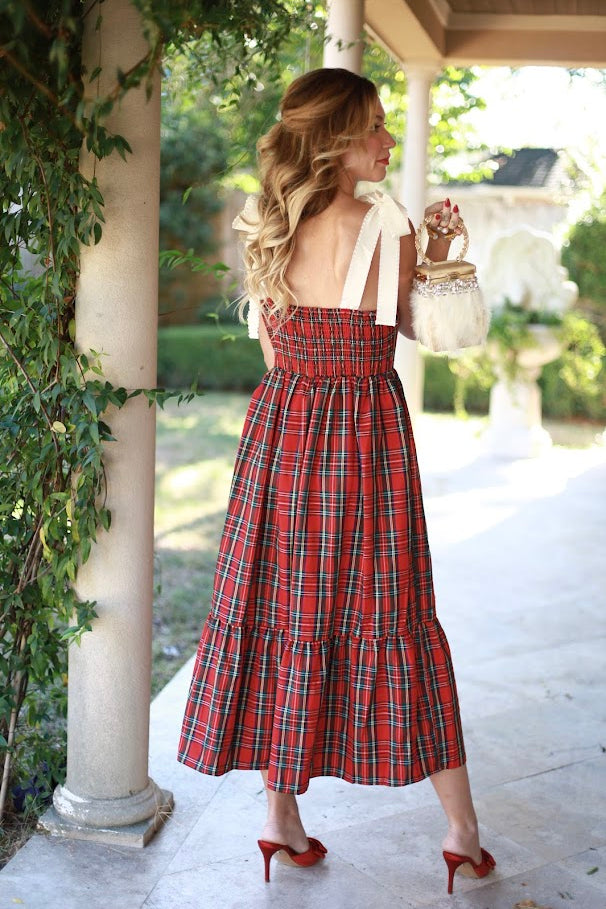 WRAPPED IN A BOW RED PLAID MAXI DRESS