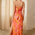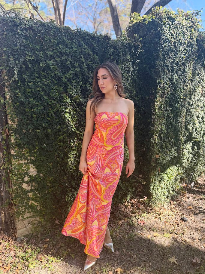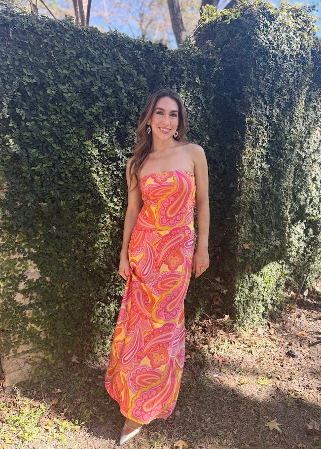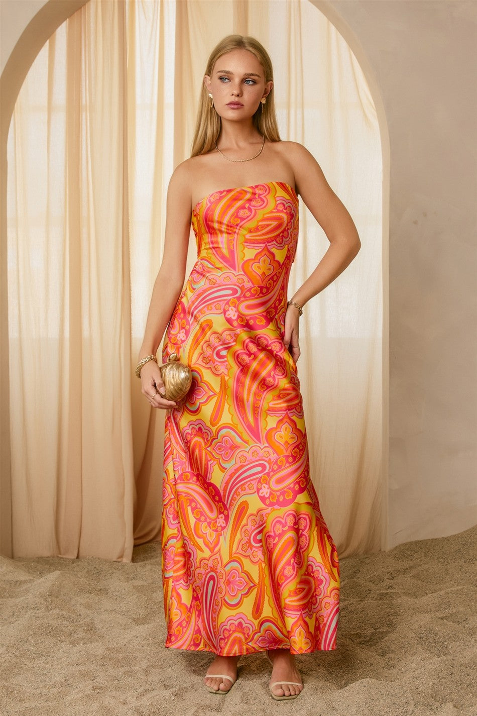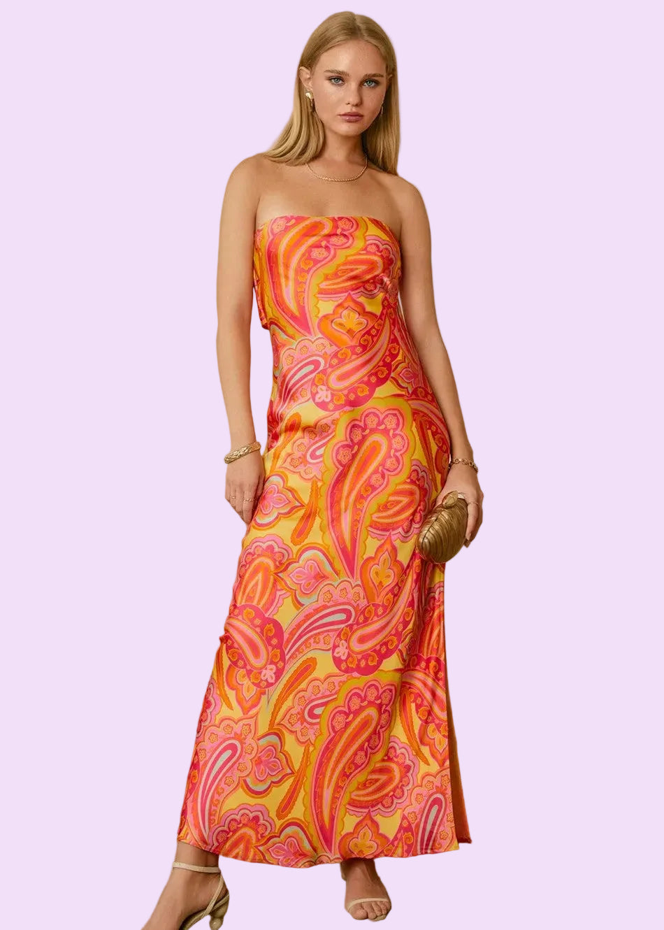 Slip into effortless elegance with this stunning GILDED GARDEN STRAPLESS MAXI DRESS. The paisley-printed satin fabric drapes beautifully while the smocked back panel and tie closure add a flirty twist. Gel grippers keep everything in place, while the side slit and elastic waistband with shirring ensure comfort all night long. Fully lined for confidence from every angle.