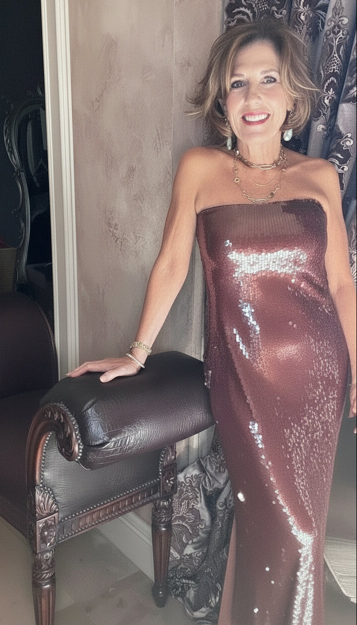 Turn heads in this stunning OH SO ALLURING SEQUIN MAXI DRESS that combines elegance with eye-catching glamour. The rich chocolate tone flatters every complexion, while the strapless silhouette creates a sophisticated, show-stopping neckline. Shimmering sequins catch the light with every movement, and the strategic side slit adds allure and ease of movement. Complete with a lined interior for comfort and confidence, this dress transitions seamlessly from special occasions to upscale evening events.
