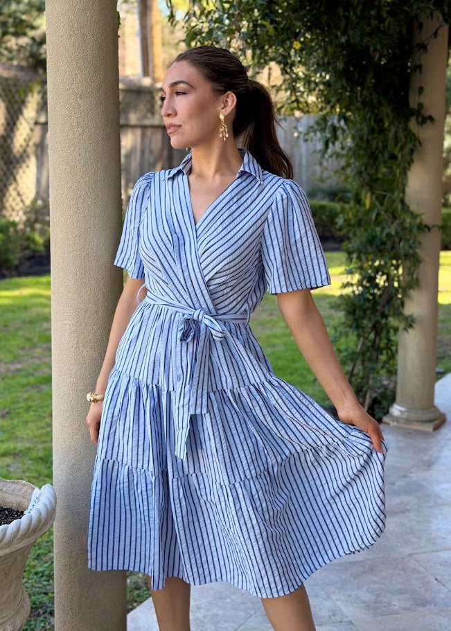 POINT THE WAY BLUE PINSTRIPE TIERED MIDI DRESS