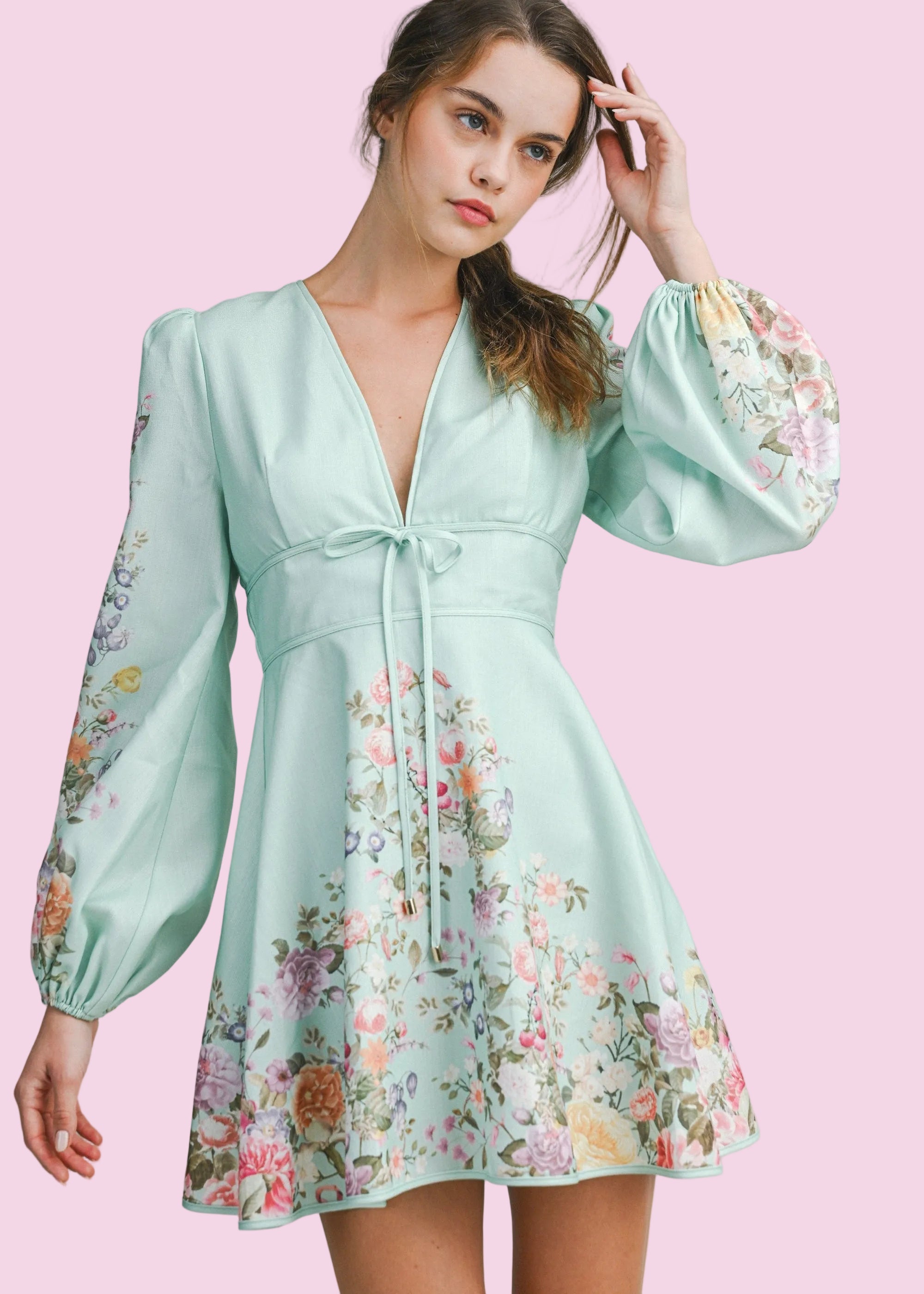 ROSE GARDEN GREEN FLORAL MINI DRESS