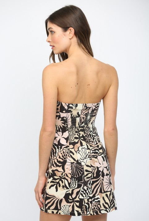 TROPICAL PRINT STRAPLESS LINEN DRESS