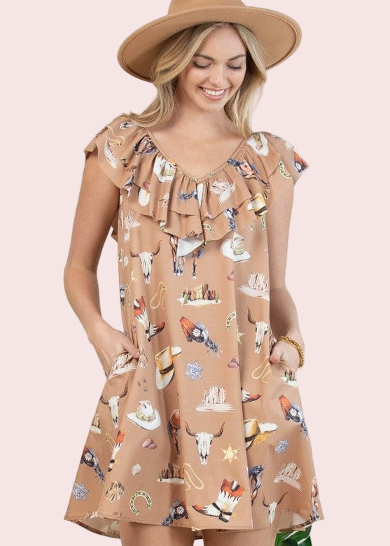 Introducing the SOUTHERN BELLE GRAPHIC PRINT DRESS—sleeveless and A-line, featuring a fun double ruffle neckline and handy pockets to keep your must-haves close.